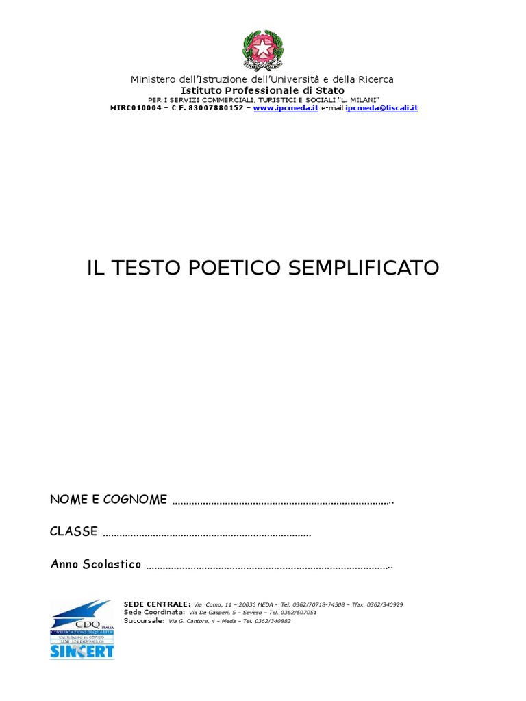 Il Testo Poetico Semplificato Ministero Dellistruzione