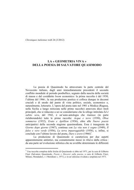 Della Poesia Di Salvatore Quasimodo Chroniques Italiennes