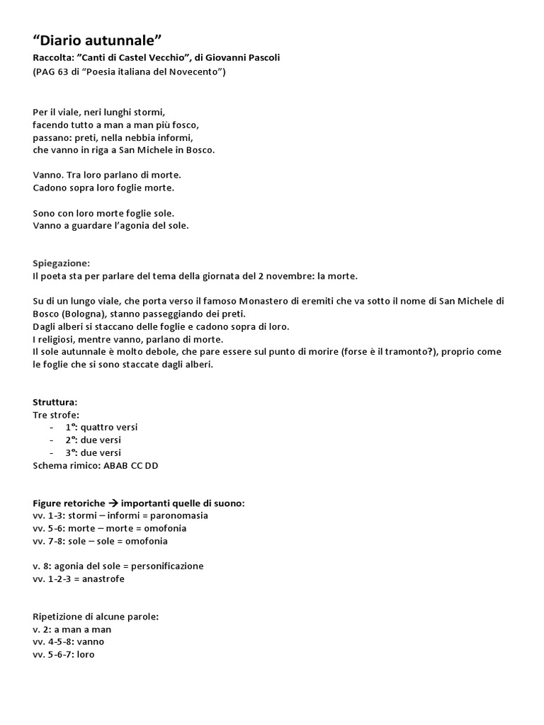 Il titolo della poesia in questione richiama la stagione autunnale tutta e in particolare il mese dellanno in cui si commemorano i propri cari defunti. Nella prima strofa della poesia di giovanni pascoli intitolata novembre viene descritto un sereno quadro naturalistico. La poesia e ricca di musicalita in positivo per ottenere un linguaggio impressionistico.